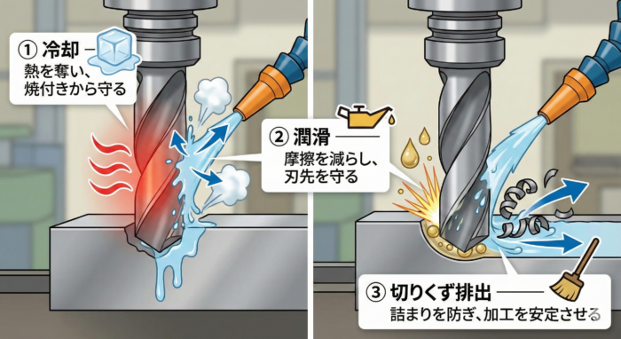切削工具の形状以外で性能を語るとき、材質やコーティング等に注目されがちですが、実は「切削油」も刃物の力を引き出す重要なパートナーです。油を“ただの冷却剤”と思っていると、工具寿命を大きく損ねてしまうことがあります。ここでは、切削油が刃物を助ける3つの働きと、油性・水溶性それぞれの特性について解説します。